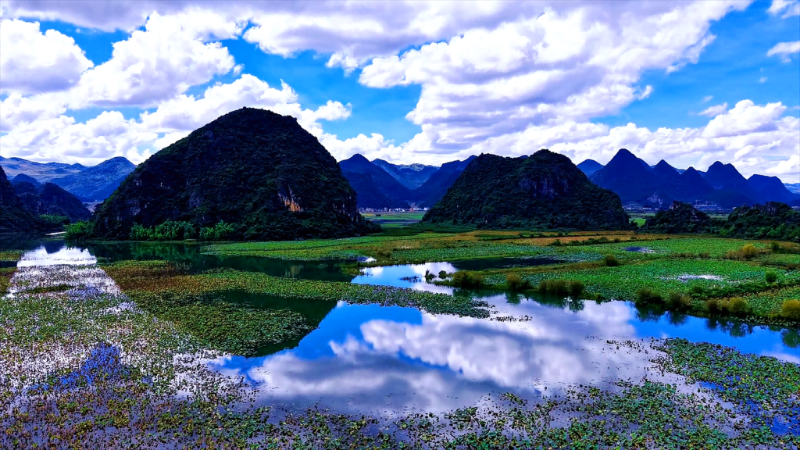人間忽晚,山河已秋。云南文山普者黑的山水漸漸被暈染成一幅幅氤氳靈動的水墨長卷。