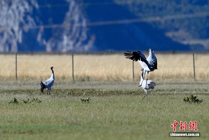 10月15日,3只黑頸鶴在納帕海嬉戲。 陳志明 攝