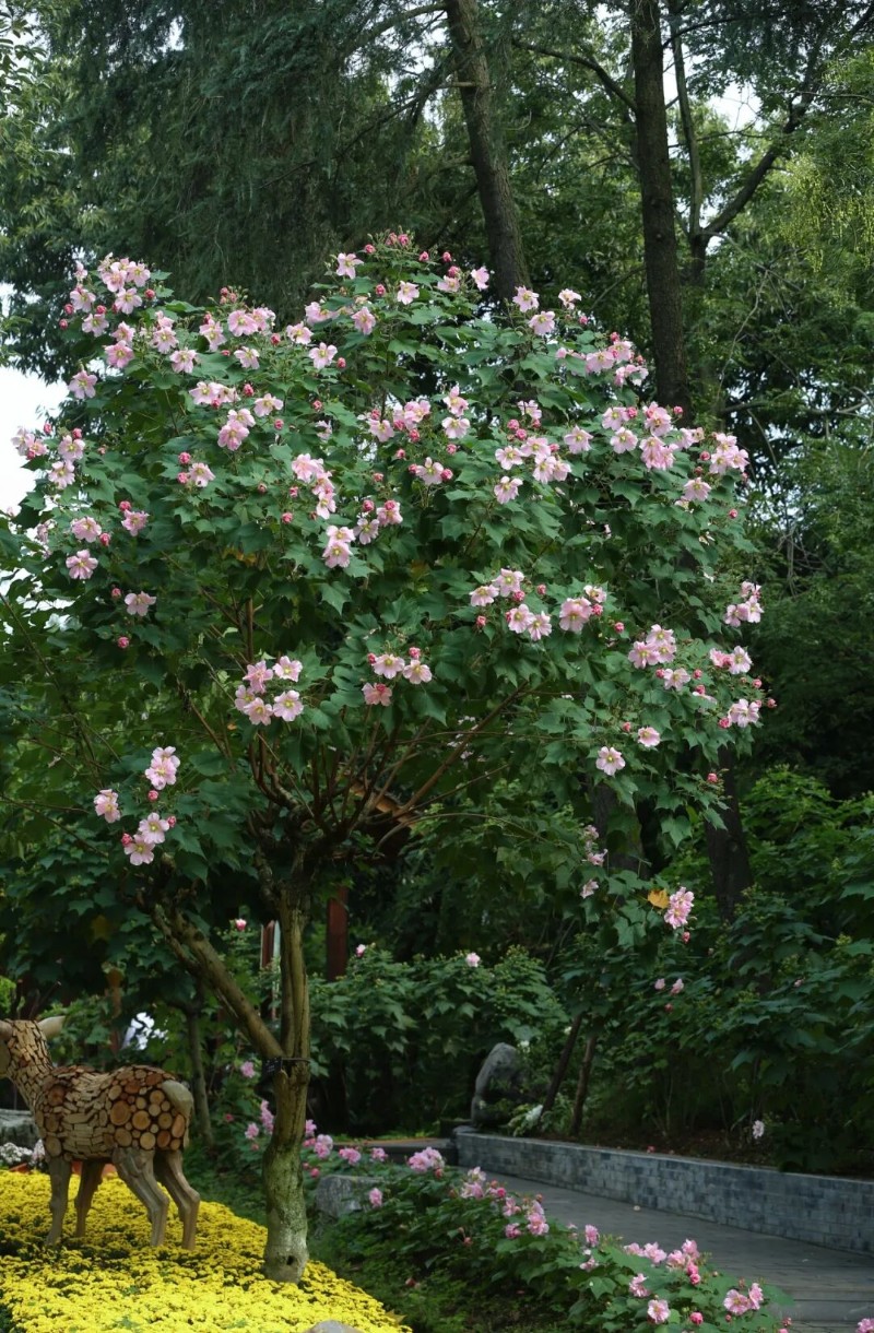 五代后蜀時,皇帝孟昶為花蕊夫人在城墻種滿芙蓉,深秋一到,四十里城墻全被花海覆蓋,成都也因此有了蓉城的美名。如今在芙蓉園中,滿樹繁花肆意綻放,仿佛將當年“四十里如錦繡”的盛景重現(xiàn)。
