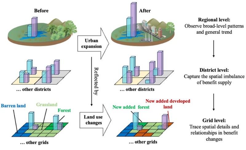 圖1城市擴(kuò)張對(duì)人類福祉多尺度影響概念圖