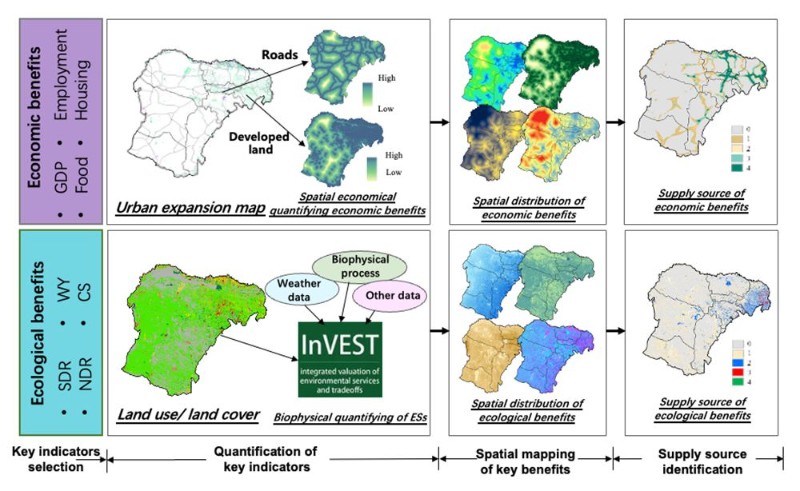 城市作為社會(huì)、經(jīng)濟(jì)和自然復(fù)合的系統(tǒng),是生態(tài)保護(hù)與經(jīng)濟(jì)增長(zhǎng)矛盾最為突出的區(qū)域??焖俚某鞘袛U(kuò)張?jiān)谕苿?dòng)區(qū)域經(jīng)濟(jì)發(fā)展的同時(shí),也常常導(dǎo)致空氣質(zhì)量下降、水資源短缺和碳儲(chǔ)量減少,從而威脅居民的多維度福祉。如何在保障經(jīng)濟(jì)效益和社會(huì)效益的同時(shí),提升自然生態(tài)系統(tǒng)服務(wù)功能,成為迫切需要解決的關(guān)鍵問(wèn)題。
