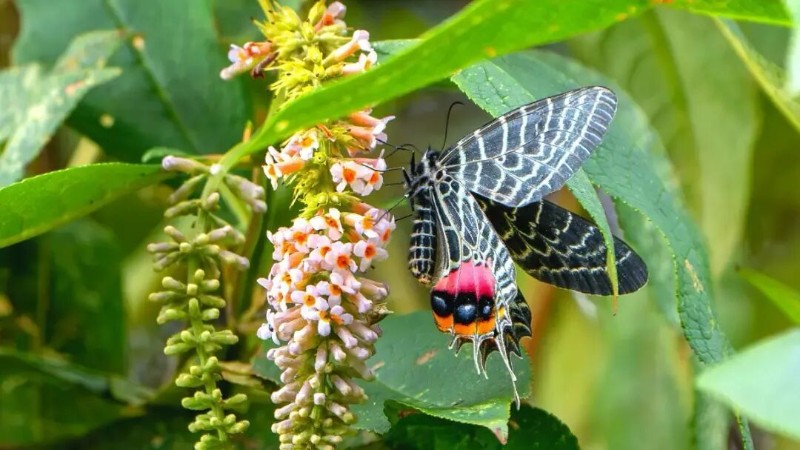 作為生物多樣性的重要組成部分,蝴蝶是食物鏈的重要一環(huán),也是生態(tài)環(huán)境狀況最敏感的指示物種。多尾鳳蝶的黑色翅面由對稱白色線條相間,尾部有兩個紅黑色眼斑格外醒目,因其稀少而美麗,被稱為“高山美人”。得益于優(yōu)越的生態(tài)環(huán)境,以及保護區(qū)對森林資源的有效保護,首次在云南永德大雪山國家級自然保護區(qū)發(fā)現(xiàn)國家二級保護動物多尾鳳蝶,不僅豐富了保護區(qū)的物種名錄,也為研究該物種的分布、習(xí)性提供了重要線索。