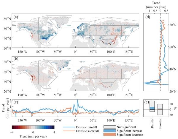 在空間格局上,極端降雨的增強范圍覆蓋了22%的研究區(qū),而極端降雪顯著增加的區(qū)域僅占4.7%,主要局限在高緯度(>70°N)和高海拔的寒冷環(huán)境。值得注意的是,盡管極端降雪的總體趨勢不顯著,但在極地及部分高山地區(qū),海冰退縮與大氣水汽反饋仍可能放大極端降雪事件的風險。