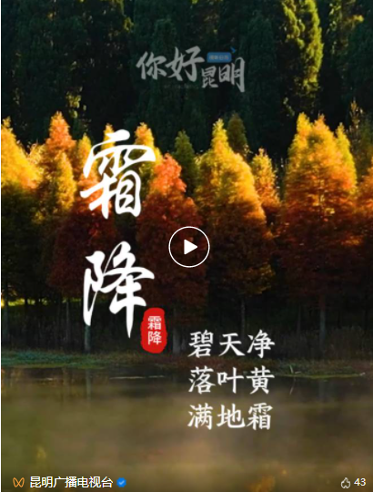 霜降是二十四節(jié)氣中的第十八個(gè)節(jié)氣,秋季的最后一個(gè)節(jié)氣。一朝秋暮,遍地霜華,這個(gè)時(shí)節(jié)的昆明,正是深紅出淺黃,百里共斑斕。