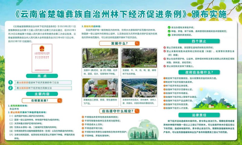 內(nèi)容創(chuàng)新,“小切口”立法,煥發(fā)法律生命力。楚雄州森林資源豐富,全州林地面積3103.28萬(wàn)畝,森林面積2648.56萬(wàn)畝,森林覆蓋率62.09%,森林蓄積量達(dá)1.31億立方米,林業(yè)產(chǎn)業(yè)發(fā)展?jié)摿薮?。但由于林下?jīng)濟(jì)發(fā)展中的許多實(shí)際問(wèn)題無(wú)法可依,導(dǎo)致楚雄州林下經(jīng)濟(jì)處于起步階段,資源潛力沒(méi)有得到充分挖掘,2022年,全州林下經(jīng)濟(jì)產(chǎn)值109.97億元,僅占林草行業(yè)總產(chǎn)值的34%。針對(duì)這一情況,為了踐行綠水青山就是金山銀山發(fā)展理念,保護(hù)和合理利用森林資源,促進(jìn)林下經(jīng)濟(jì)健康有序發(fā)展,持續(xù)推進(jìn)鄉(xiāng)村振興。2023年楚雄州在國(guó)內(nèi)率先制定首部《云南省楚雄彝族自治州林下經(jīng)濟(jì)促進(jìn)條例》(以下簡(jiǎn)稱(chēng)《條例》),為林下經(jīng)濟(jì)高質(zhì)量發(fā)展提供法律保障?!稐l例》是“小切口”“小快靈”的成功立法實(shí)踐。