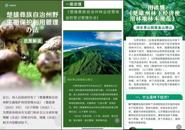 機(jī)制創(chuàng)新,出臺(tái)配套政策,優(yōu)化發(fā)展環(huán)境。自《條例》施行以來(lái),為推動(dòng)《條例》落地實(shí)施,楚雄州共制定印發(fā)實(shí)施4個(gè)規(guī)范性文件、1個(gè)技術(shù)規(guī)范、2個(gè)重要文件、3個(gè)計(jì)劃及實(shí)施方案?!冻垡妥遄灾沃菀吧Wo(hù)利用管理辦法》(以下簡(jiǎn)稱(chēng)《辦法》)是全國(guó)首個(gè)野生菌保護(hù)管理規(guī)范性文件,為加強(qiáng)野生菌資源保護(hù)利用,規(guī)范經(jīng)營(yíng)管理,實(shí)現(xiàn)野生菌資源可持續(xù)利用提供了依據(jù);《楚雄彝族自治州林業(yè)經(jīng)營(yíng)收益權(quán)登記管理辦法》(以下簡(jiǎn)稱(chēng)《辦法》)《楚雄彝族自治州小微濕地公園管理辦法》都是全省首個(gè)政府行政規(guī)范性文件,為進(jìn)一步深化楚雄州集體林權(quán)制度改革提供法治賦能;《楚雄州林業(yè)草原行政許可中介服務(wù)管理辦法》進(jìn)一步優(yōu)化了林草法治營(yíng)商環(huán)境,提高了林草審批質(zhì)效;《楚雄州林下經(jīng)濟(jì)使用林地林木規(guī)范》(以下簡(jiǎn)稱(chēng)《規(guī)范》)為楚雄州林下經(jīng)濟(jì)健康有序發(fā)展提供了配套技術(shù)規(guī)范,對(duì)指導(dǎo)全州林下經(jīng)濟(jì)依法、科學(xué)、合理利用林地林木資源,確保林下經(jīng)濟(jì)健康、有序發(fā)展具有重要的意義。