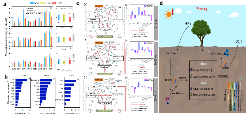 圖1. 增溫對(duì)南亞熱帶森林土壤微生物殘?bào)w碳的影響