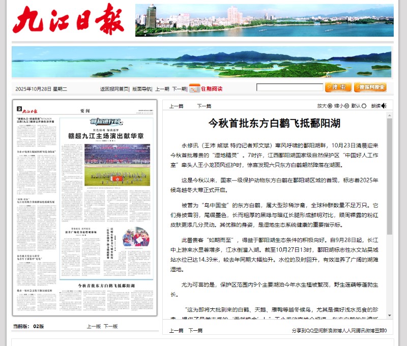 九江日?qǐng)?bào):今秋首批東方白鶴飛抵鄱陽(yáng)湖