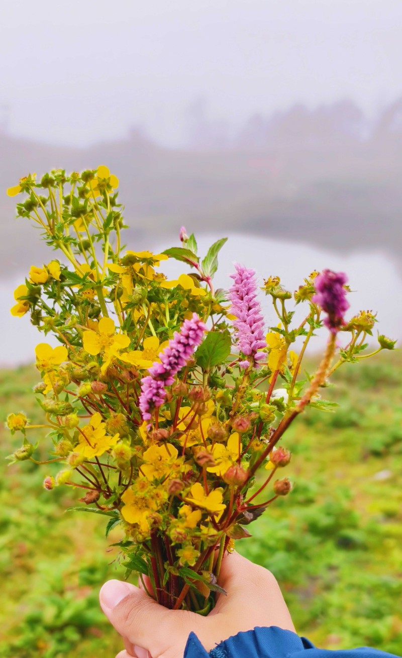 山林間,手中的山花絢爛多彩,黃色的野菊、粉色的蓼花交織成自然的花束。腳下的“刺毛白珠”如藍(lán)寶石般點綴在翠綠灌木叢間,顆顆飽滿、色澤絢麗。“刺毛白珠”的存在本身就是最直觀的生態(tài)標(biāo)尺,作為對生長環(huán)境極其挑剔的物種,它只在水質(zhì)純凈、空氣清新、植被完整的原生態(tài)區(qū)域安家,宛如大自然精心設(shè)置的“生態(tài)監(jiān)測員”。這種對生態(tài)條件的高度依賴,讓它成為當(dāng)?shù)厣鷳B(tài)質(zhì)量的“活名片”,印證著“兩山”理念的守護(hù)成果,也為這幅生態(tài)畫卷增添了自然肌理與生命活力。