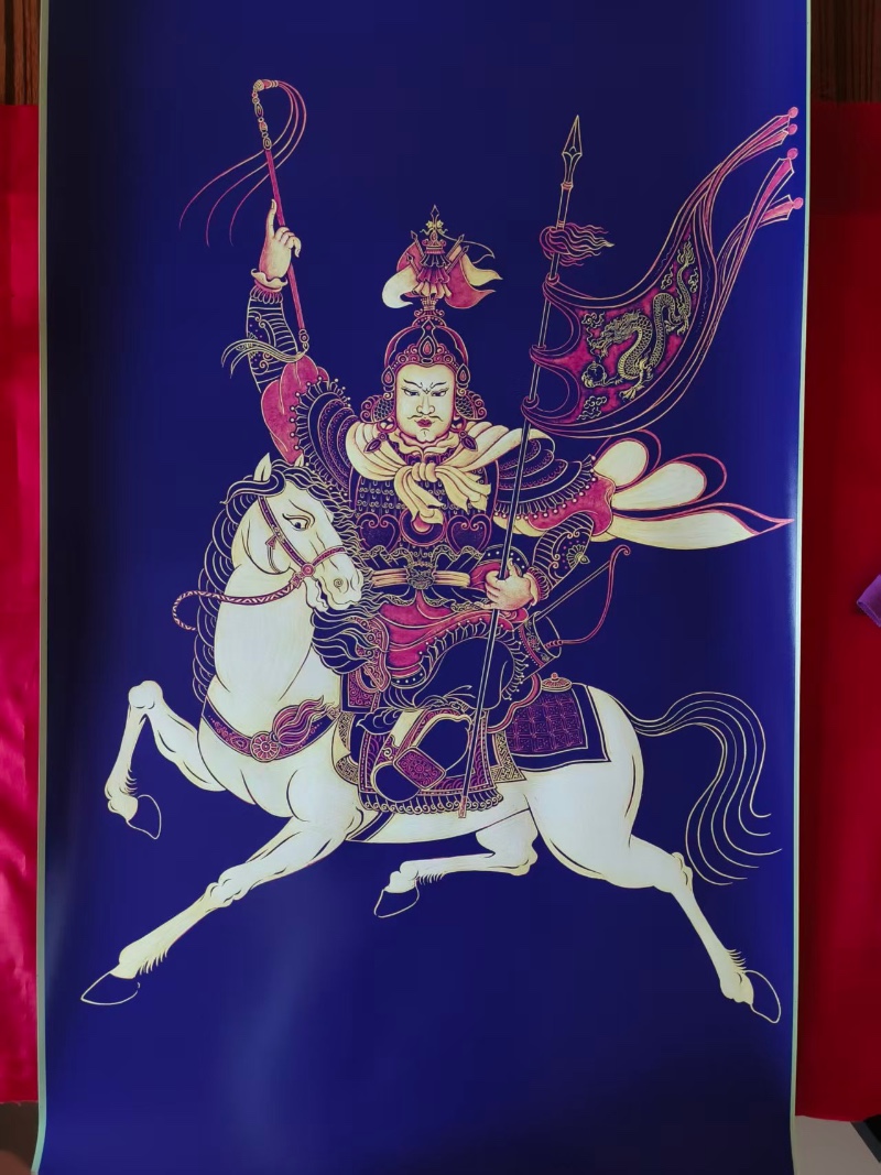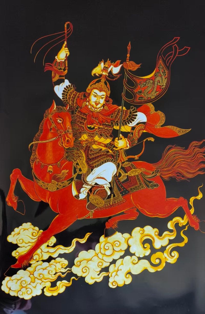 注釋:"一騎絕塵"化用《史記》中項(xiàng)羽"單騎沖陣"的典故,卻賦予其藏地馬背文化的獨(dú)特性:格薩爾王策馬疾馳,馬蹄掀起的煙塵竟驚散了宿夜之霧,暗示其行動(dòng)對既有秩序的沖擊;"雙戟凌空"則將兵器升華為象征符號(hào),破曉之光既是自然時(shí)序的轉(zhuǎn)換,更是英雄以武力開辟新紀(jì)元的隱喻。兩相對照,形成"動(dòng)與靜""暗與明"的哲學(xué)張力。