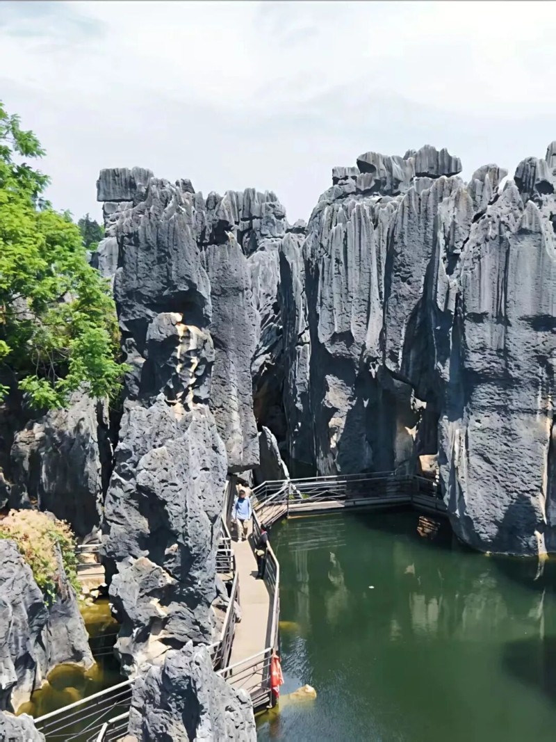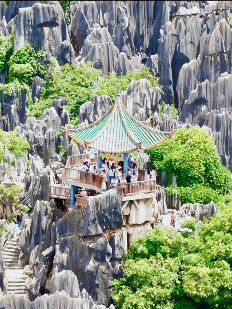 從景區(qū)入口乘觀光車直達“大、小石林景區(qū)”,先逛大石林,跟著指示牌走“劍峰池—望峰亭—雙鳥渡食”路線,望峰亭是俯瞰石林全景的最佳點位,一定要拍照!