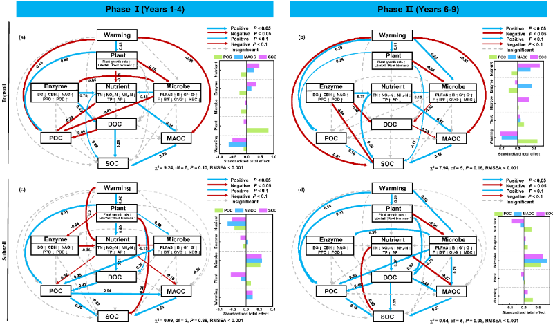針對(duì)這一問題,中國(guó)科學(xué)院華南植物園鼎湖山站劉菊秀研究員團(tuán)隊(duì)于2012年在鼎湖山站建立了野外生態(tài)系統(tǒng)水平被動(dòng)增溫實(shí)驗(yàn)平臺(tái)( 0°C、 1.0°C、 2.1°C),開展了長(zhǎng)期觀測(cè)研究。研究發(fā)現(xiàn),土壤不同有機(jī)碳組分對(duì)增溫的響應(yīng)受增溫時(shí)間的影響。土壤有機(jī)碳對(duì)增溫的響應(yīng)呈“兩個(gè)階段”(圖1、2和3):在第一階段(1–4年),增溫導(dǎo)致土壤有機(jī)碳凈損失,主要由于增溫刺激的植物-微生物養(yǎng)分競(jìng)爭(zhēng)導(dǎo)致土壤表層礦物結(jié)合態(tài)有機(jī)碳顯著減少;在第二階段(6–9年),由于持續(xù)的植物碳輸入和微生物碳代謝的熱調(diào)整使得植物來源的顆粒有機(jī)碳顯著增加,從而導(dǎo)致土壤有機(jī)碳的凈積累。這些結(jié)果表明,在適度增溫下,一些濕潤(rùn)的熱帶和亞熱帶森林土壤可能繼續(xù)積累有機(jī)碳,挑戰(zhàn)了以往僅基于土壤增溫實(shí)驗(yàn)而得出的結(jié)論:即普遍預(yù)測(cè)未來變暖會(huì)使熱帶和亞熱帶森林成為碳源。該研究加深了人們對(duì)增溫下植物-土壤相互作用如何驅(qū)動(dòng)亞熱帶森林土壤有機(jī)碳長(zhǎng)期動(dòng)態(tài)變化的理解。