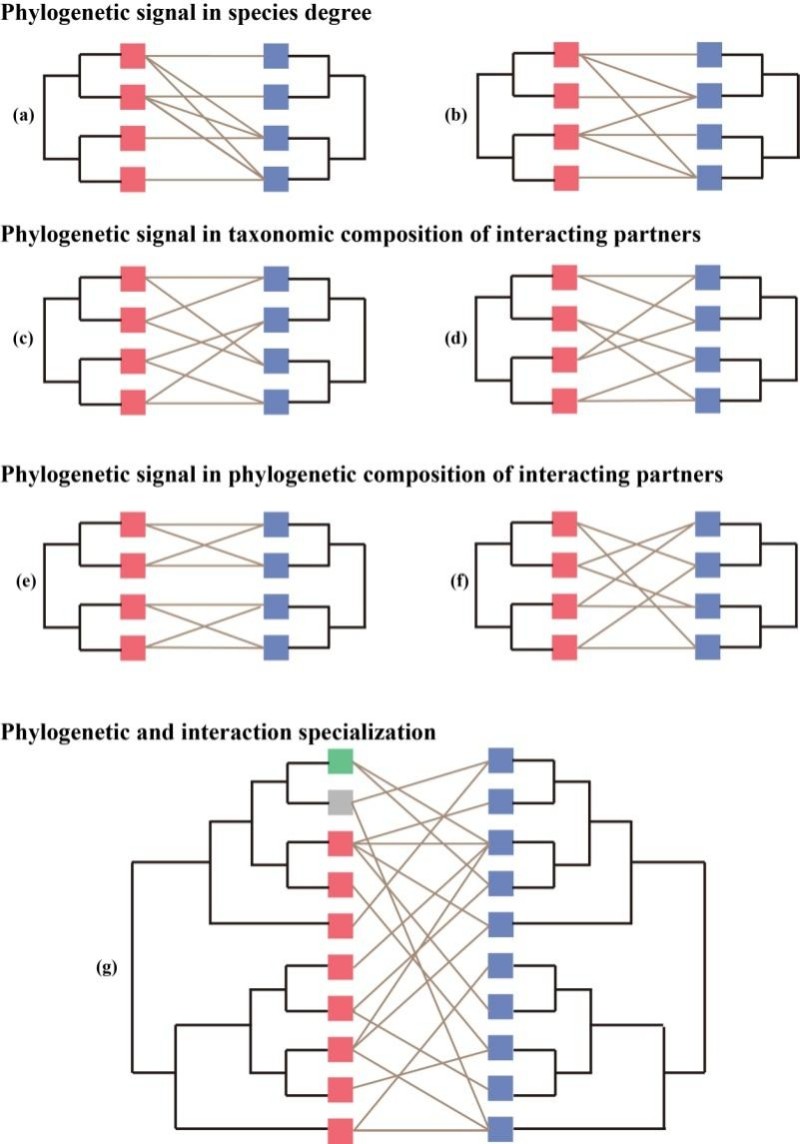 圖1.二分互作網(wǎng)絡(luò)不同情形下的系統(tǒng)發(fā)育效應(yīng)示意圖。a與b:互作伙伴數(shù)量(物種度)的系統(tǒng)發(fā)育信號(hào);c與d:互作伙伴物種組成的系統(tǒng)發(fā)育信號(hào)。e與f:互作伙伴系統(tǒng)發(fā)育組成的系統(tǒng)發(fā)育信號(hào);g:不同的物種系統(tǒng)發(fā)育專性與互作專性關(guān)系(綠色及灰色顯示物種)。