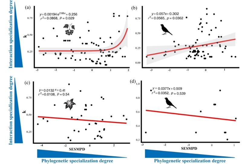 研究發(fā)現(xiàn),互作伙伴數(shù)量的系統(tǒng)發(fā)育信號(hào)在鳥類和植物中均較弱,表明互作伙伴數(shù)量更多受其他因素(如表型特征)驅(qū)動(dòng)。然而,在互作伙伴的物種組成及系統(tǒng)發(fā)育組成方面,系統(tǒng)發(fā)育信號(hào)存在較大差異。其中,系統(tǒng)發(fā)育距離相近的鳥類(尤其是食果鳥類)傾向于與具有相似物種組成和系統(tǒng)發(fā)育組成的植物互作,而這一模式在植物中并不明顯。研究還發(fā)現(xiàn),系統(tǒng)發(fā)育專性的食果鳥類往往也是互作專性物種,即它們傾向于與少數(shù)系統(tǒng)發(fā)育距離更近的植物物種互作。這種模式在傳粉鳥類以及結(jié)果植物和開花植物中均未觀察到,揭示了不同互作系統(tǒng)中生態(tài)?;呗缘牟町?。