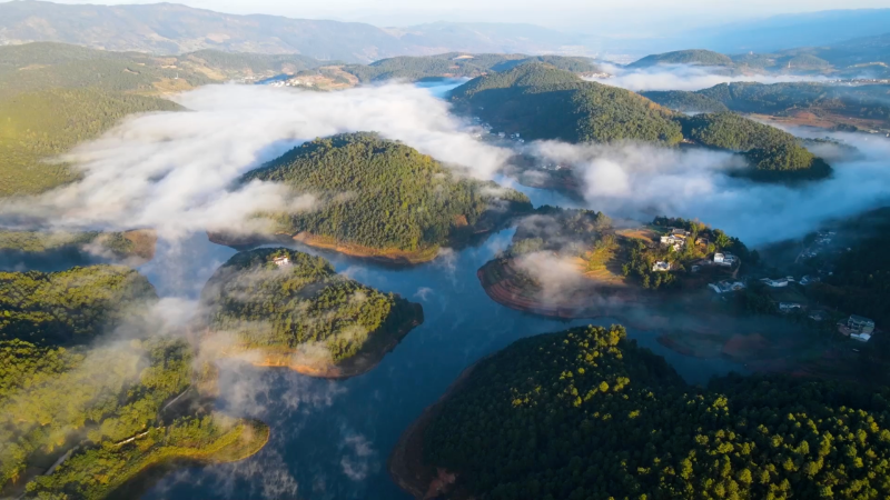行走于三塊石水庫的任何角落,放眼望去皆是山依水繞、碧波千頃。群山如垂簾,在天水間構(gòu)成一道天然屏障,讓風(fēng)景沒有煙波浩渺的空寂,盡顯山清水秀的精致。若登高借助航拍俯視,便可見群山延綿處,湖面與山脈交融共生,呈自然流淌之態(tài),如翡翠明珠般鑲嵌其間:一頭伸向施甸壩子,一頭奔赴姚關(guān)大地,以婀娜身姿承載起塵世煙火與地方民生。孕育與饋贈(zèng)是它的神圣使命,納百川而滋潤(rùn)萬物。一道閘門四季開闔,調(diào)節(jié)著水勢(shì),奔騰的水花一路蜿蜒歡歌,隨河流貫穿云嶺大地,讓這方水土春有花爛漫,夏有荷芬芳,秋有糧殷實(shí),冬有藏豐盛。