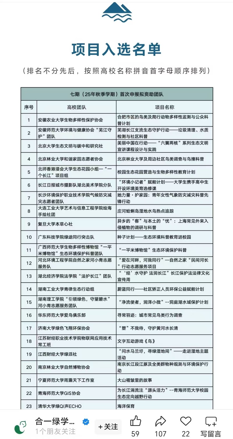 近日,江西財(cái)經(jīng)大學(xué)綠派社捷報(bào)頻傳。社團(tuán)在江西省九江市永修縣開展的生態(tài)實(shí)踐項(xiàng)目,成功在10月23日入選2025年“中國(guó)大學(xué)生知行促進(jìn)計(jì)劃”(簡(jiǎn)稱“知行計(jì)劃”)全國(guó)十大優(yōu)秀實(shí)踐團(tuán)隊(duì);同時(shí),其策劃的濕地保護(hù)項(xiàng)目“‘問(wèn)水馬蘭圩,尋綠濕地間’——走進(jìn)濕地主題活動(dòng)”也成功獲得“涓流行動(dòng)”立項(xiàng)認(rèn)可,實(shí)現(xiàn)社團(tuán)發(fā)展的新突破。