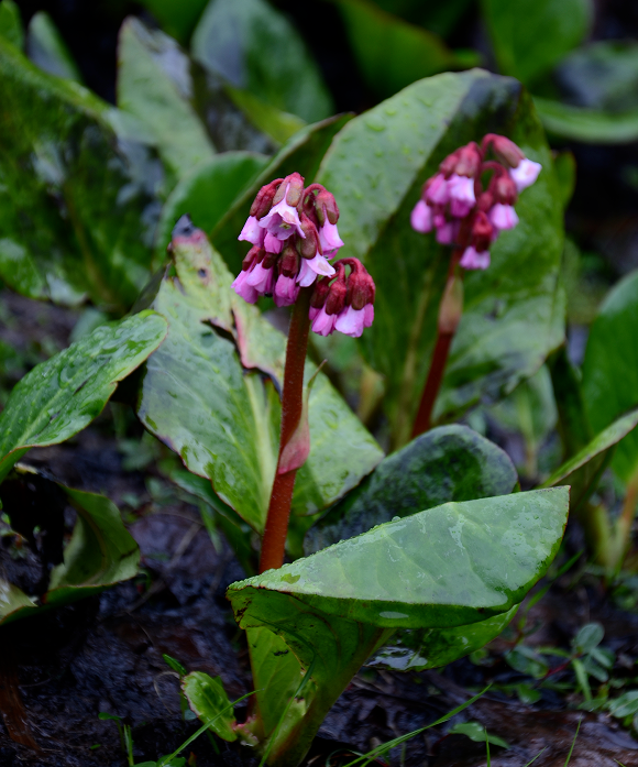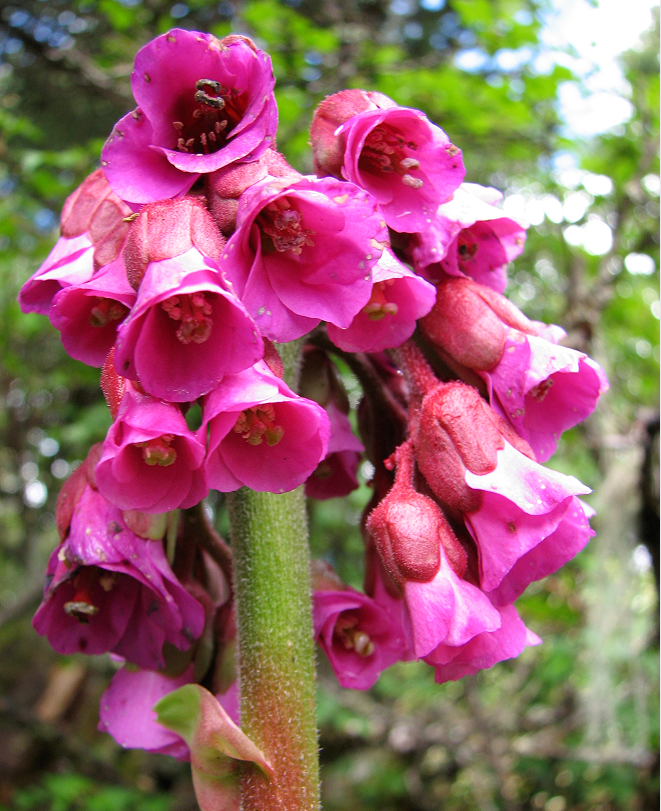 虎耳草科巖白菜屬多年生草本。高30—35厘米,根狀莖粗壯。葉片革質(zhì),綠色至深綠色,長(zhǎng)10—20厘米,寬5—10厘米,葉柄長(zhǎng)5厘米。圓錐狀聚傘花序,長(zhǎng)15—35厘米,直立,花朵數(shù)量10—20朵,花瓣粉紅色、紫紅色,偶有淺紫色。花期為每年4—8月,單株花期最長(zhǎng)可接近90天。成熟期8—10月,種子細(xì)小,千粒重0.1—0.2克,極易散落。