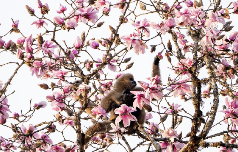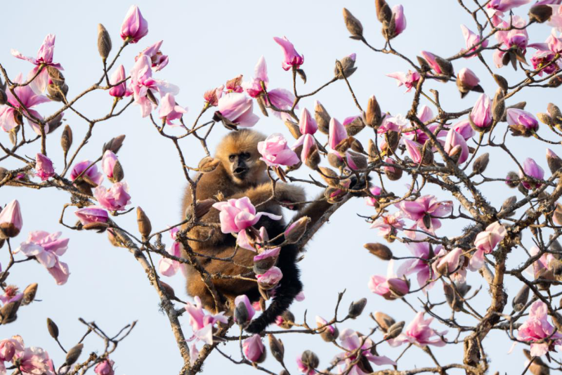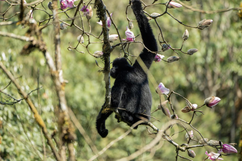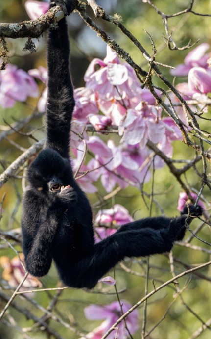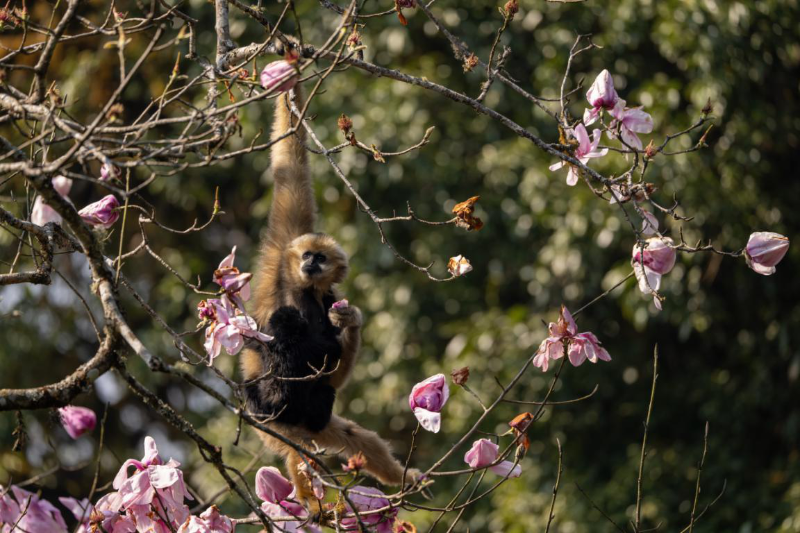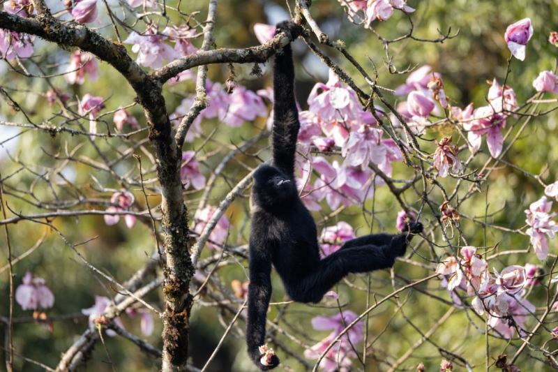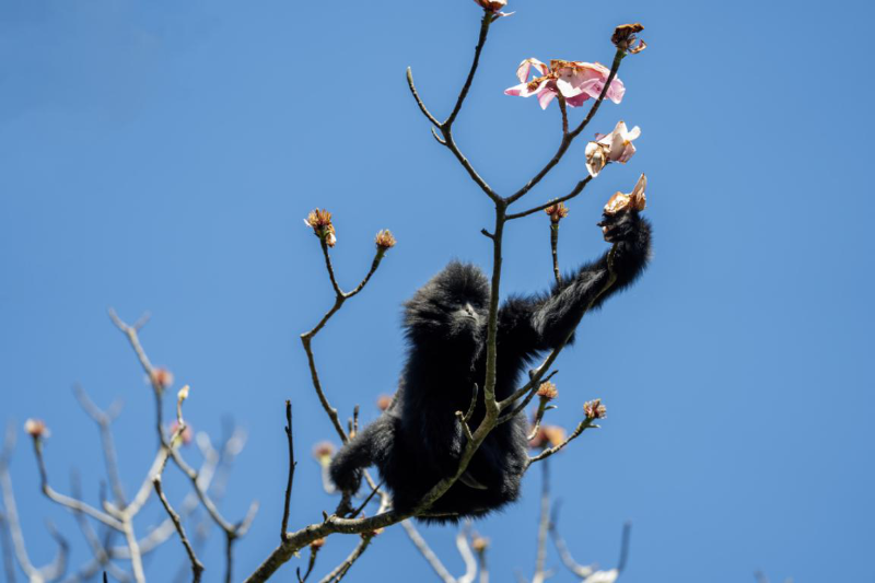 10月24日是國際長臂猿日,云南哀牢山國家級自然保護區(qū)楚雄片區(qū)的工作人員在近日的日常巡護中,拍攝到一組清晰的西黑冠長臂猿活動照片。畫面中,長臂猿在林間靈活攀跳、以花瓣為食,展現(xiàn)出良好的野外生存狀態(tài)。