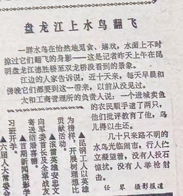 時(shí)間回溯至1985年11月19日,春城晚報(bào)《盤龍江上水鳥翻飛》的報(bào)道讓市民驚喜:得勝橋至雙龍橋段突然飛來一群“不速之客”,行人駐足凝望,不忍驚擾這份自然的饋贈(zèng)。