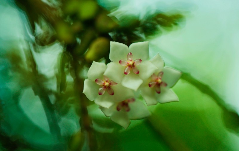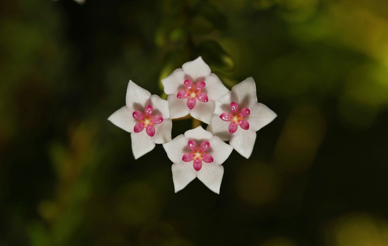 恩格勒球蘭是夾竹桃科球蘭屬多年生懸垂藤本植物,因其花型近似球狀而得名。葉片呈狹梨形,葉緣稍外卷。傘形花序腋生,花冠呈輻射對(duì)稱的五星形結(jié)構(gòu),主花冠潔白,副花冠(冠柱)由紫紅色漸變?yōu)橥该髯仙w狀,直徑約2厘米。