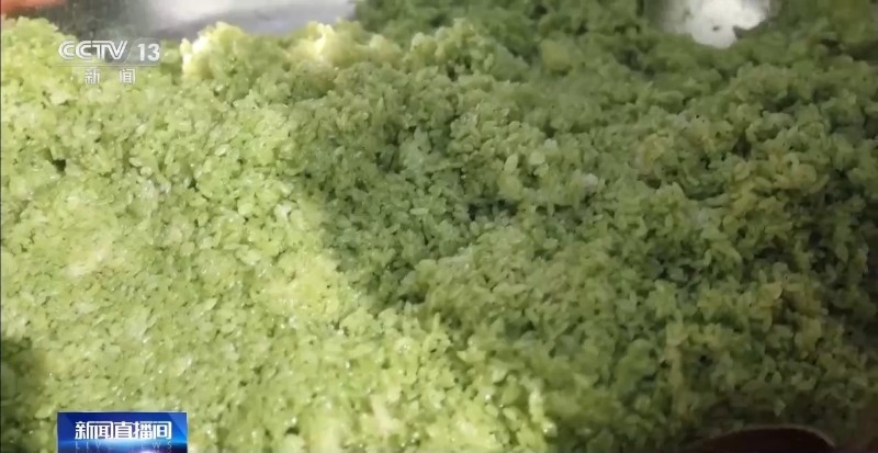 經(jīng)過(guò)清洗、舂碎、過(guò)濾等多道工序,提取出的姜葉汁還要混合當(dāng)?shù)氐亩喾N調(diào)料,配合豬油炒制,再與蒸熟的糯米充分拌勻。這樣,色澤翠綠、清香撲鼻的姜汁糯米飯就做好了。