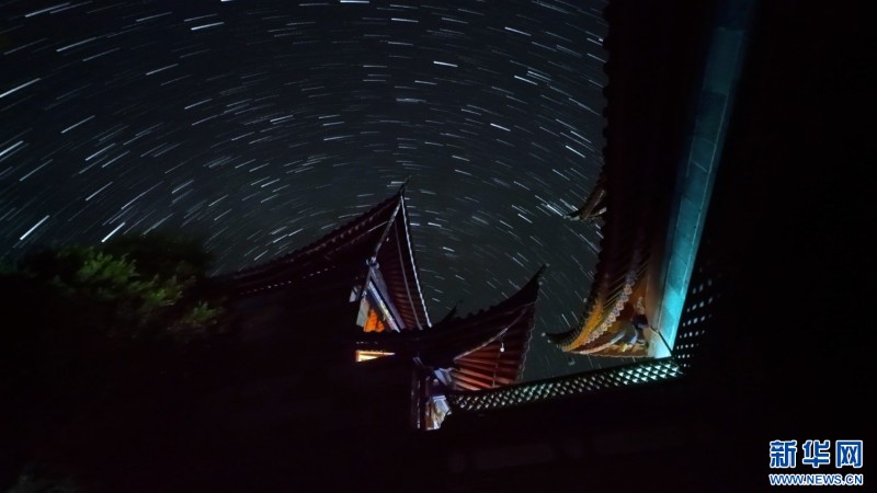 近日,攝影師在云南省騰沖市新岐冒盔山用延時(shí)攝影拍攝到夜空群星璀璨,星軌在山頭旋轉(zhuǎn),夢(mèng)幻而浪漫。(趙輝 李諺 錢林川)