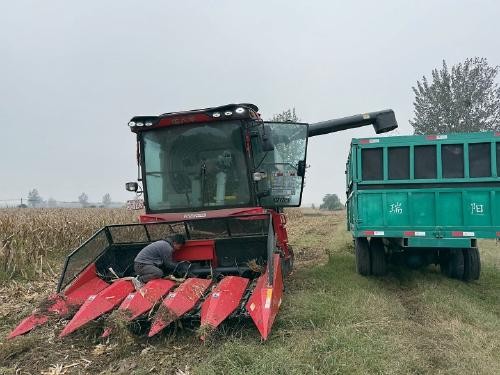 10月11日,天晴后的第二天,天空又下起了小雨。這比預(yù)報的降雨早了一天,細雨落在玉米地,剛被陽光曬得半干的土壤很快又泛起潮氣。李建財?shù)妮喪绞崭顧C已經(jīng)在地里作業(yè)了兩天,1200畝玉米才完成四分之一的收割進度。雨不大,但機器輪胎沾上濕泥后容易打滑,他將收割機停在空地上,用一根木棍清理卡在割臺里的秸稈和石頭。
