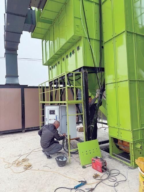 ④王智民購置的固定烘干塔,工人做最后的安裝。