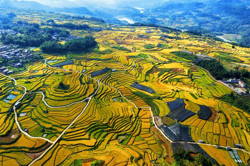 待到秋收時節(jié),龍江梯田又換了一身盛裝。金黃的稻穗壓彎了腰,層層疊疊的田塊如鋪展開的金色階梯,從山腳一直延伸到天邊。農(nóng)人們手持鐮刀穿梭其間,金黃的稻稈在身后鋪成地毯,谷粒脫落在竹筐里,發(fā)出“簌簌”的聲響。稻花魚在稻谷間來回穿梭,不時躍出水面,打碎了秋風的漣漪,也奏出了豐收最動聽的節(jié)奏。夕陽西下,余暉將梯田染成溫暖的橙紅色,田埂的影子被拉得很長,像是大地在暮色中寫下了溫柔詩行。