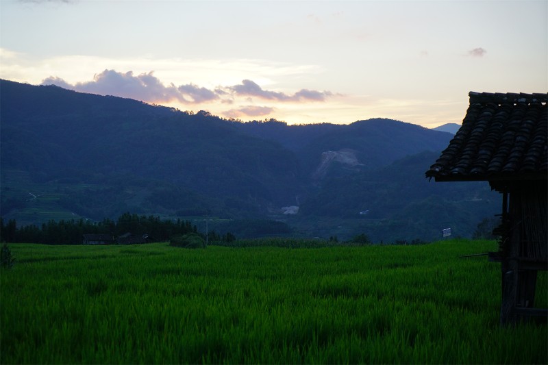 若是遇上雨天,龍江梯田則會更添幾分靈動。細密的雨絲落在田里,濺起一圈圈極小的漣漪,原本清晰的田壟被雨霧揉成朦朧的色塊,青的山、綠的稻、灰的云融在一起,仿佛一幅會呼吸的水墨畫。雨停后,田埂邊的青苔吸飽了水分,越發(fā)鮮綠,水珠掛在稻穗上,風過時便簌簌落下,砸在下方的田水里,驚起細碎的水花,像是誰不小心打翻了裝滿珍珠的匣子。