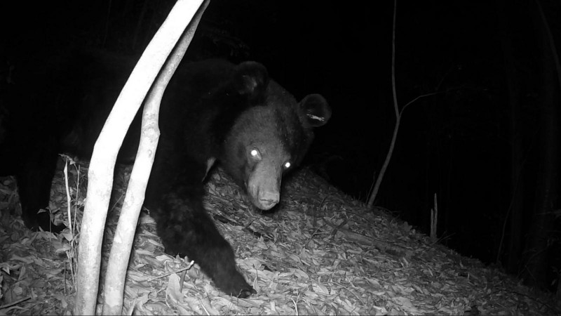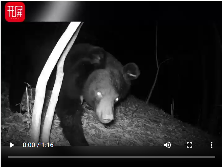 到了晚上,保護(hù)區(qū)成為各種野生動(dòng)物的樂園。只見三只體型較大的成年中國(guó)豪豬睜著明晃晃的大眼睛從紅外相機(jī)鏡頭前依次走過。紅外相機(jī)還成功吸引了亞洲黑熊的注意,只見它在鏡頭前呆呆地看了一眼,然后走近鏡頭給自己拍了個(gè)美美的自拍,還好奇地舔了舔相機(jī)嘗嘗味道。