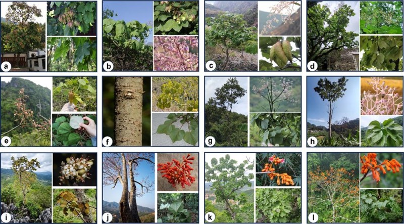 圖1.中國梧桐屬植物照片。(a)梧桐屬隱存譜系1;(b)梧桐屬隱存譜系2;(c)云南梧桐;(d)梧桐(栽培);(e)龍州梧桐;(f)丹霞梧桐;(g)海南梧桐;(h)大圍山梧桐;(i)克式梧桐;(j)火桐;(k)美麗火桐;(l)廣西火桐。