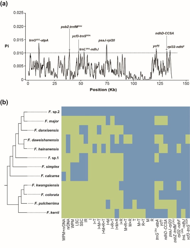 圖2.(a)基于葉綠體基因組核苷酸多態(tài)性識別出的八個高變區(qū)域;(b)采用最大似然法建樹對上述高變區(qū)域與六個DNA超級條形碼(WPM nrDNA、nrDNA、WPM、LSC、SSC、IR)、四個植物DNA通用條形碼(nrITS(I)、matK(M)、rbcL(R)、trnH-psbA(T))及其所有可能的組合進行物種鑒定效率比較。綠色代表鑒定成功,藍色代表鑒定失敗。