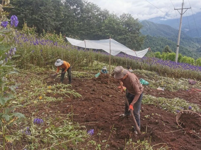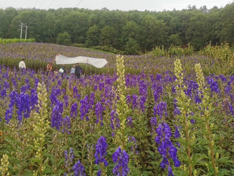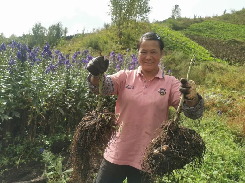 銅牛甸小組位于海拔2800多米的山區(qū),這里土地肥沃、陽(yáng)光充足,為附子的生長(zhǎng)提供了得天獨(dú)厚的生長(zhǎng)條件。近年來(lái),銅牛甸小組依托當(dāng)?shù)氐牡乩砑皻夂騼?yōu)勢(shì),積極調(diào)整產(chǎn)業(yè)結(jié)構(gòu),發(fā)展特色中藥材產(chǎn)業(yè),壯大綠色經(jīng)濟(jì),小組形成了以附子、廣木香等為主的中藥材主打品種,帶動(dòng)群眾增收致富。在銅牛甸小組的房前屋后,附子種植基地映入眼簾,大片紫色的附子花次第盛開,一株株盛開的附子花,閃著青紫色的光芒,花色嬌艷,花姿優(yōu)美,又像一串串紫瑩瑩的風(fēng)鈴在微風(fēng)中搖曳。村民們趁著晴好天氣采挖附子,熱鬧的勞作聲和藥農(nóng)們的笑聲構(gòu)成一道美麗的秋收風(fēng)景線。
