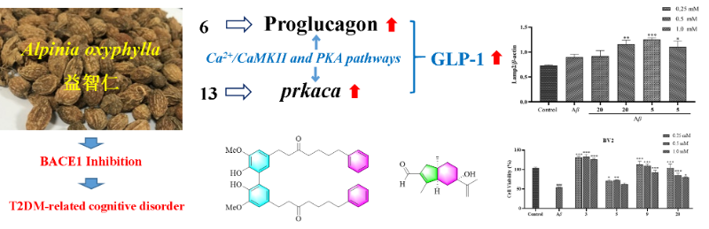 在中醫(yī)理論中,益智具有收斂和補腎陽功效。該研究基于益智的補腎陽作用發(fā)現(xiàn)其中的黃酮和二芳基庚烷類成分具有BACE1 抑制活性,特別是yakuchinone B 以非競爭/反競爭混合方式抑制BACE1活性,結構中的OH-4'與Ser36和Ile126殘基形成氫鍵,是重要的活性位點。進一步與云南中醫(yī)藥大學陳興龍副教授團隊合作,發(fā)現(xiàn)4個化合物對Aβ-誘導的BV2細胞損傷具有保護作用,其分子機制與抑制BACE1活性,下調BACE1蛋白表達,增強溶酶體自噬有關(Fitoterapia, 2024, 178,106157)。上述研究表明,中藥益智的活性成分除具有降糖作用外,還具有治療糖尿病認知障礙的潛力。
