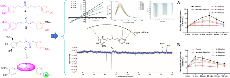 二芳基庚烷是益智的主要降糖活性成分之一,研究團隊基于二芳基庚烷的基本骨架通過骨架躍遷和官能團替換策略,設計合成了24個新型α-葡萄糖苷酶抑制劑,構效關系分析表明4-氰基為關鍵藥效團,揭示電子效應是酶抑制活性的決定因素。特別是4-氰基取代衍生物5c具有顯著的α-葡萄糖苷酶抑制活性(IC50=18.1 μM),是阿卡波糖活性的17倍。通過多光譜分析和分子對接研究了該分子的酶抑制機制,表明主要通過焓-熵協(xié)同驅動機制與α-葡萄糖苷酶發(fā)生可逆結合,作用模式包含氫鍵作用、靜電作用和疏水作用,誘導酶二級結構改變,從而降低酶的表面疏水性。同時,該化合物對α-葡萄糖苷酶的抑制活性受大分子擁擠環(huán)境的顯著影響,提示空間位阻效應和疏水分配作用在配體-靶標識別中的重要性。該化合物能劑量依賴地降低淀粉和蔗糖負荷小鼠的血糖水平,具有潛在的降糖作用(Eur. J. Med. Chem., 2025, 300,118161)。綜上,該研究發(fā)現(xiàn)的新型二芳基戊烷類分子,具有強效的體外和體內α-葡萄糖苷酶抑制活性以及良好的藥代特性,是一類新型抗糖尿病藥物候選分子。