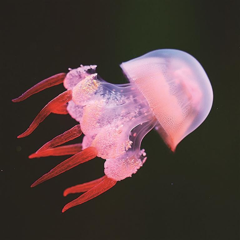 赤月水母 別名紅蜇、海蜇,屬于中大型水母。分布于熱帶、亞熱帶及溫帶沿海,身體頭部呈蘑菇狀,傘部為半球形,表面光滑,晶瑩剔透。肉食性,以浮游生物、甲殼類、多毛類甚至小的魚類為食。