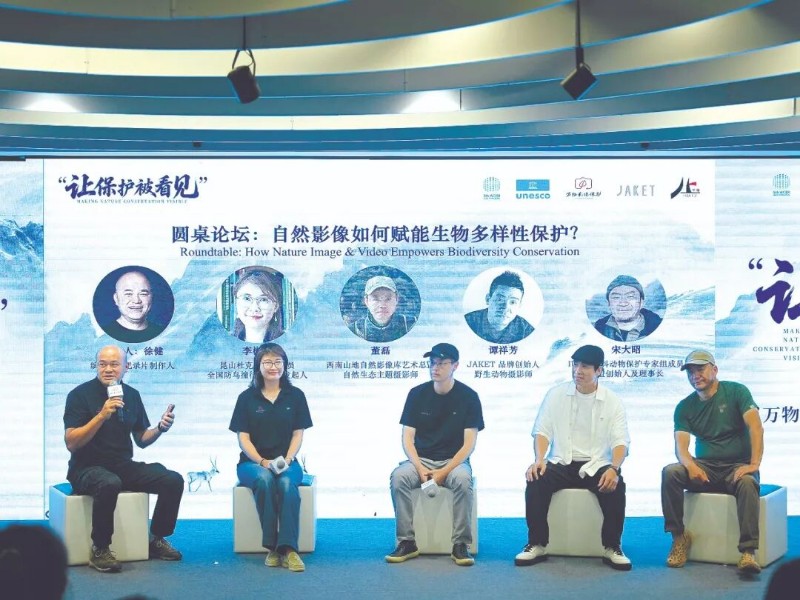 在由繽紛自然紀(jì)錄片制作人徐健主持的“自然影像如何賦能生物多樣性保護(hù)”圓桌討論環(huán)節(jié),多位嘉賓從專業(yè)角度探討如何發(fā)揮影像推動自然保護(hù)的力量,呼吁更多攝影師、保護(hù)機(jī)構(gòu)、企業(yè)加入行動,共同用影像推動保護(hù)。西南山地自然影像庫藝術(shù)總監(jiān)董磊曾被一窩豺因咬死牲畜而被吊在橋上的場景所震撼。他指出:“影像不能只展示美,更應(yīng)推動意識和行為的改變?!彼未笳驯硎?,保護(hù)離不開公眾支持,影像比文字更易引發(fā)共情和思考,應(yīng)探索保護(hù)影像的生產(chǎn)標(biāo)準(zhǔn),推動行業(yè)的共識和進(jìn)步。知名服裝品牌JAKET創(chuàng)始人譚祥芳分享了商業(yè)與保護(hù)結(jié)合的經(jīng)驗,他表示,企業(yè)投入自然保護(hù)與社會責(zé)任看似“虧錢”,但實際吸引了相同價值觀的人才和消費(fèi)者,讓品牌更健康、更富生命力。